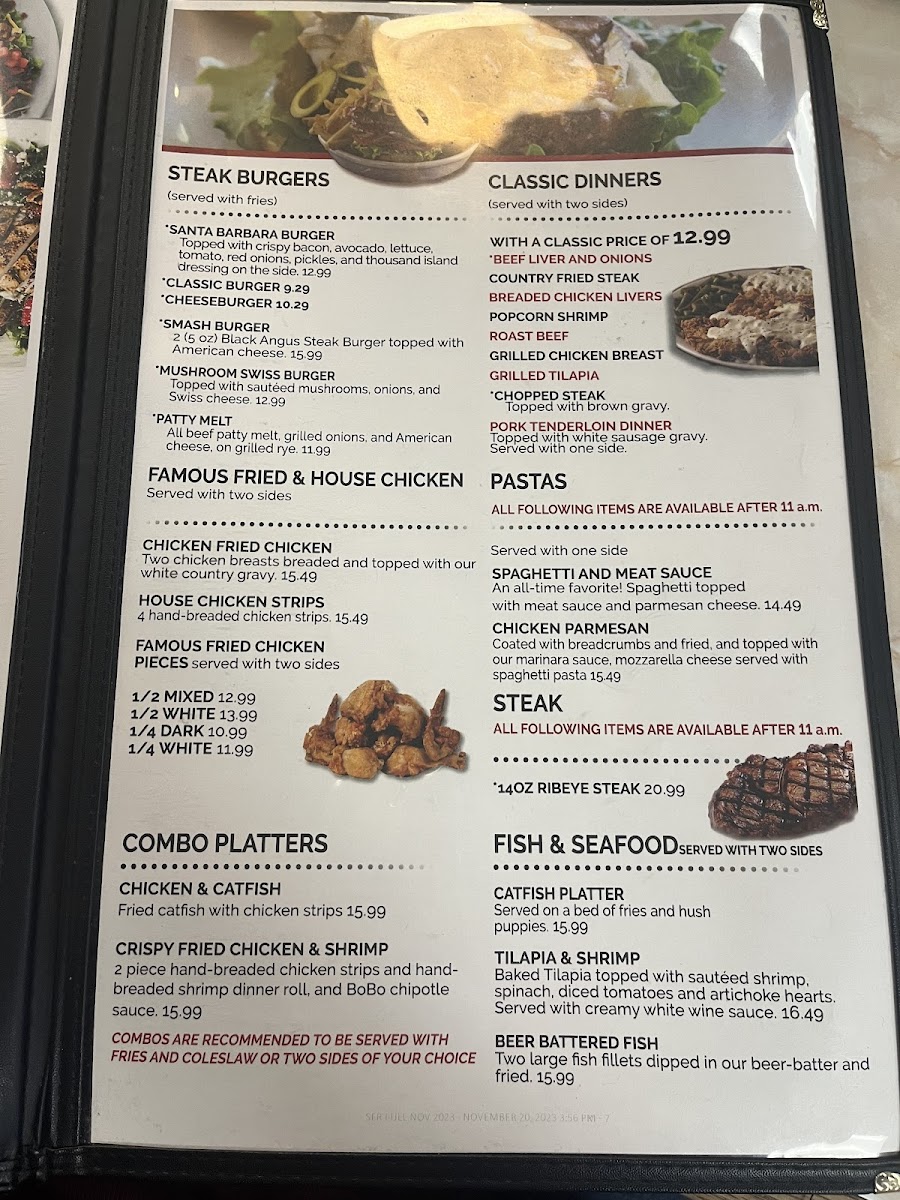 A choice of a hand-breaded 11 oz. pork tenderloin, lightly seasoned, chicken fried chicken and fried golden brown, or country fried steak topped with country sausage gravy.