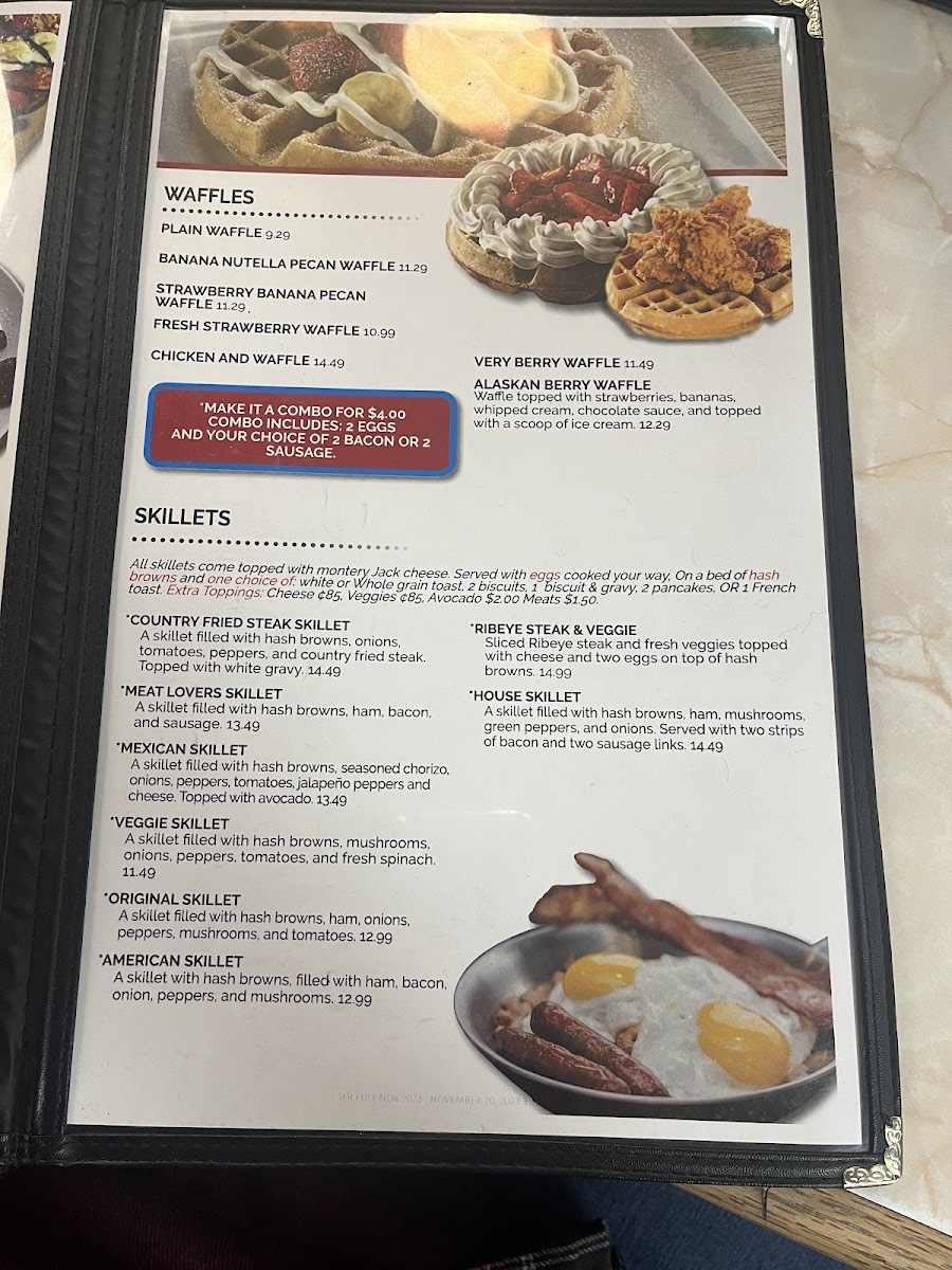 Two pieces of our Homestyle Cinnamon Swirl French Toast, 2 eggs, 2 bacon strips, 2 sausage links, a slice of ham and choice of hash browns or home fries.