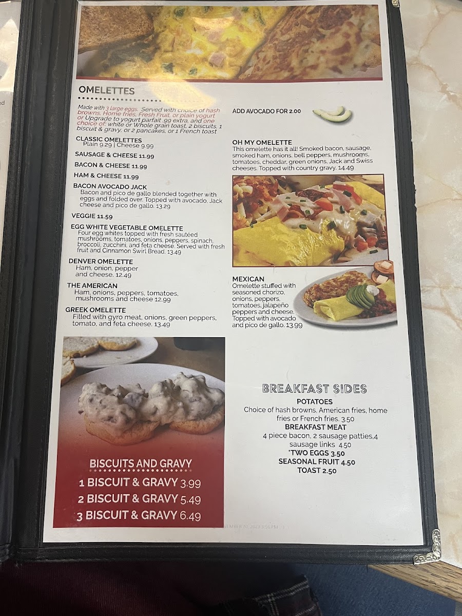 This omelette has it all! Smoked bacon, sausage, smoked ham, onions, bell peppers, mushrooms, tomatoes, cheddar, green onions, Jack and Swiss cheeses Topped with country gravy.